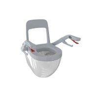 Die Toilette ist um 290 Grad drehbar und verfügt über eine Höhenverstellung von 200 mm. Es ist auch eine Version mit längeren Stützgriffen erhältlich, bei der der Abstand zwischen den Griffen größer ist.